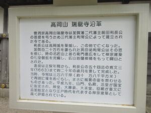 曹洞宗高岡山瑞龍寺は、加賀藩2代藩主前田利長公の菩提をとむらうため三代藩主利常によって建立された寺である。利長は高岡に築城し、この地で亡くなった。加賀百万石を譲られた義弟利常は深くその恩を感じ、時の名匠山上善右衛門嘉広をして七堂伽藍を完備し、広山恕陽禅師をもって開山とされた。 造営は正保年間から利長公の五十回忌の寛文三年(1663)までの約二十年の歳月を要した。当時、寺域は三万六千坪、周囲に壕をめぐらし、まさに城郭の姿を想わせるものがあった。