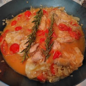 * 「玉ねぎ+トマト+白ワインで煮込む」系。トマトの酸味にも鉄フライパンが負けず、鉄ならではの焼き目が出て美味。